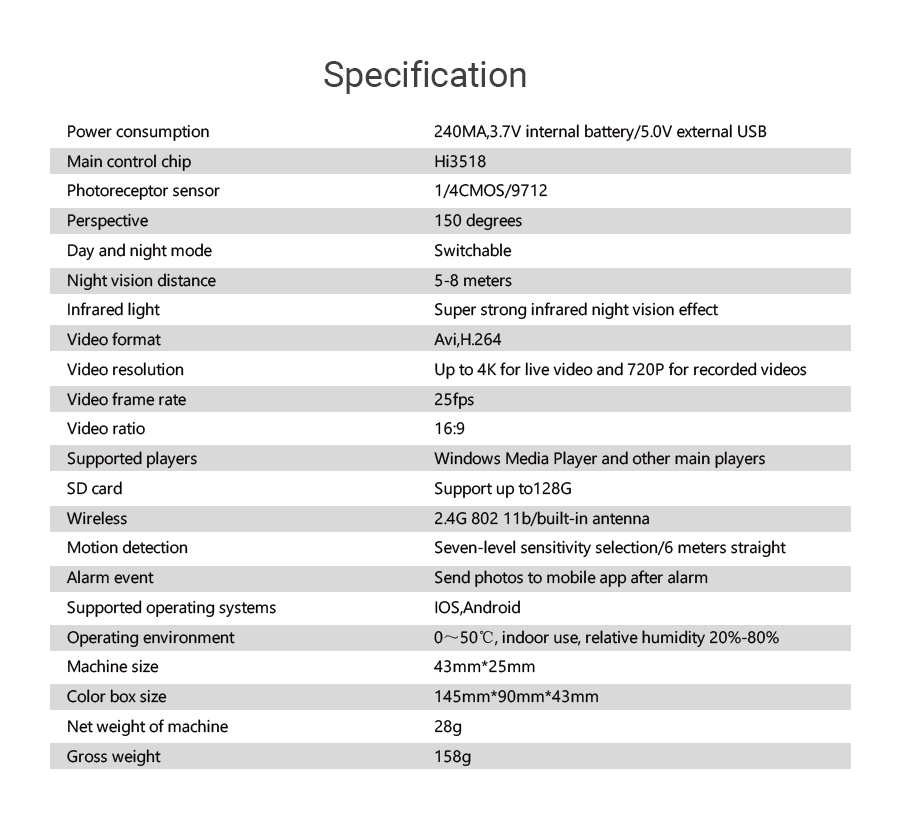 150 degree 720P HD Mini WiFi Wireless Camera with 1/4 CMOS sensor and 6 Infrared Lights, supports 4K/2K/1080P/720P live video