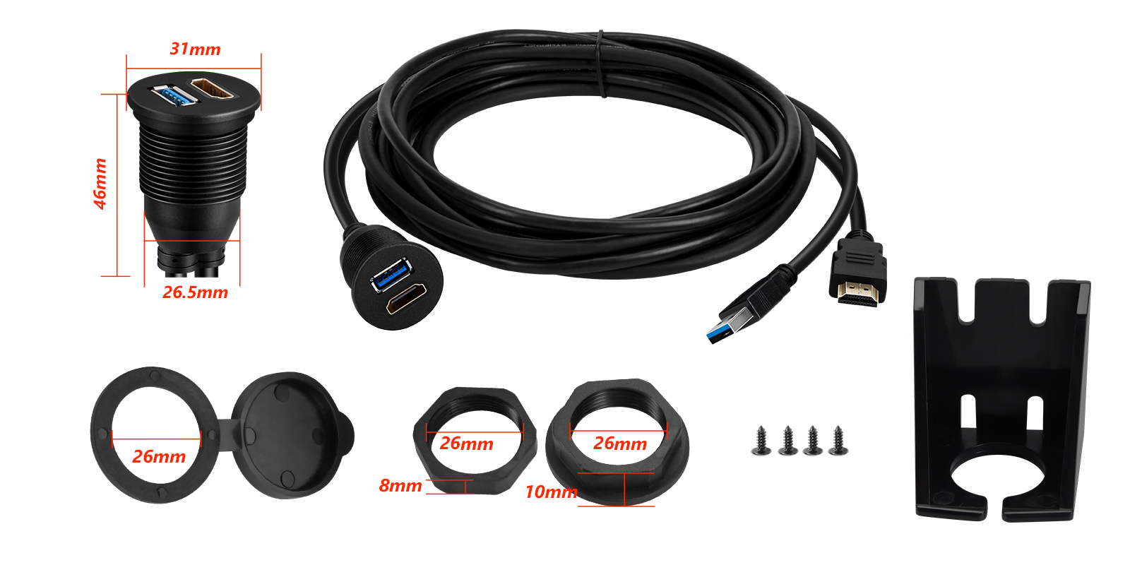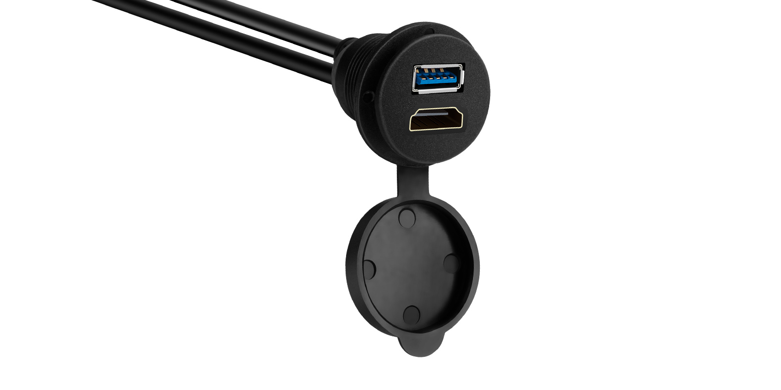 Das HDMI & USB Dashboard-Panel verfügt über ein bündiges Design, das sich nahtlos in Ihr Armaturenbrett integriert und für ein sauberes und professionelles Aussehen sorgt. Sein zigarettenanzünderähnliches Rundkabel bietet eine zuverlässige und sichere Verbindung und stellt sicher, dass Ihre Geräte während der Fahrt verbunden bleiben.