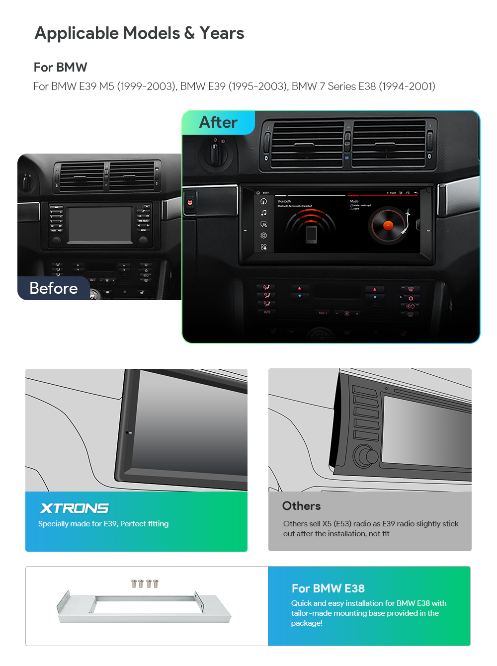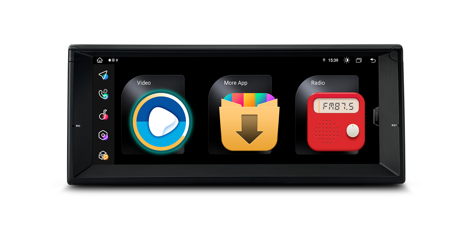 Android 13 Octa Core 4GB DDR4 RAM + 64GB Solid State ROM 10.25” 1280×480 IPS Wide Screen Car Stereo Multimedia Player GPS Navigation System with Integrated global 4G Solution Built-in CarPlay & Android Auto & DSP High Power TDA7851 Amplifier USB Tethering Stylish UI TDA7708 RDS Radio Support AHD Camera Screen Mirroring Custom Fit for BMW E39/E38