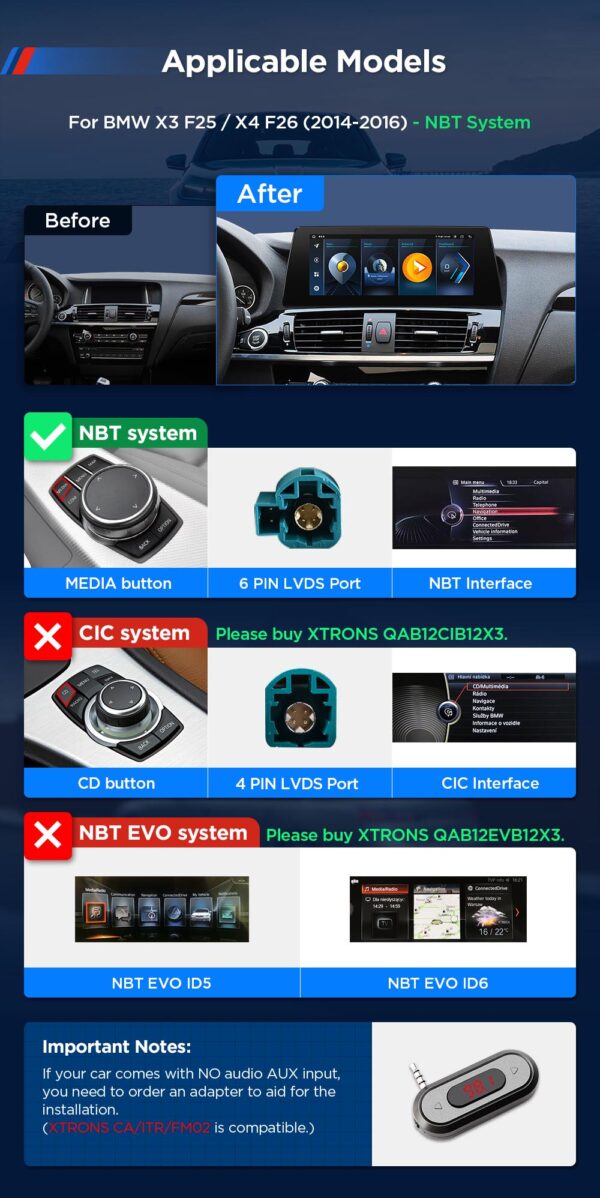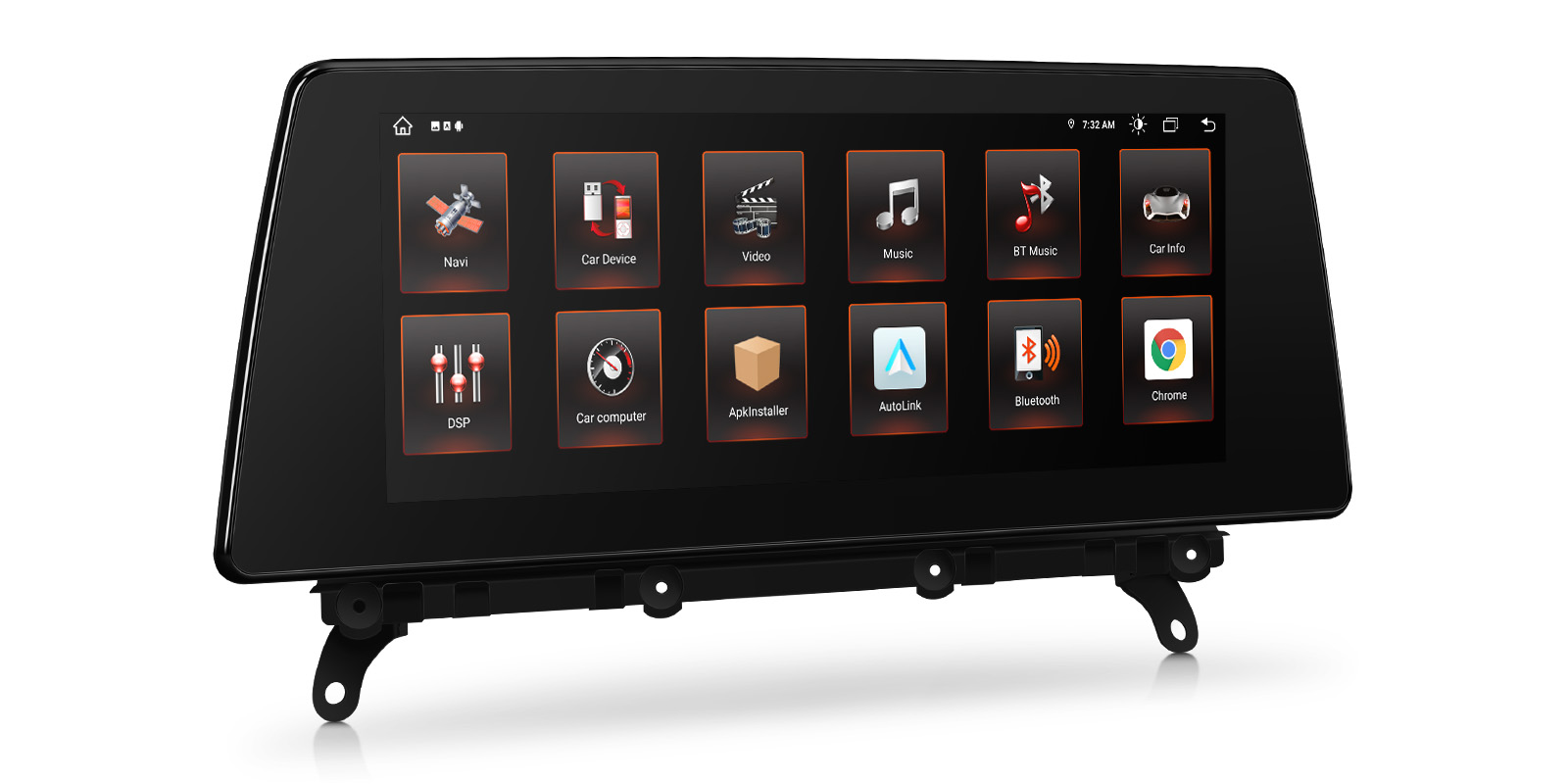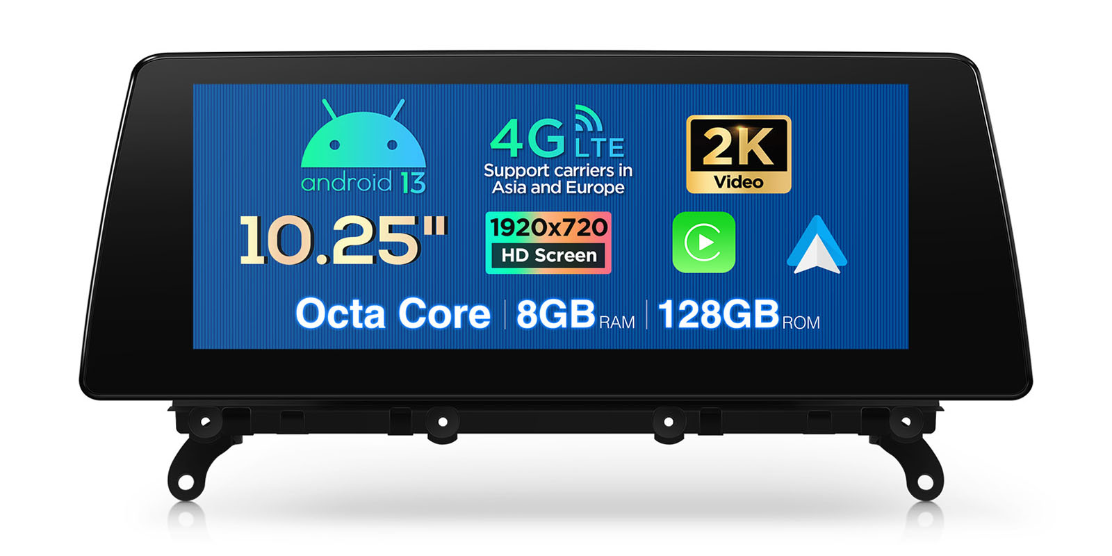 10.25″ Fully-laminated 1920×720 HD IPS Screen Android 13 Android Car Stereo with 8GB DDR4 RAM 128GB Solid State ROM Integrated 4G LTE Solution Wireless CarAutoPlay Android Auto Built-in DSP 2K Video Playback USB Tethering for BMW X3/X4 NBT System