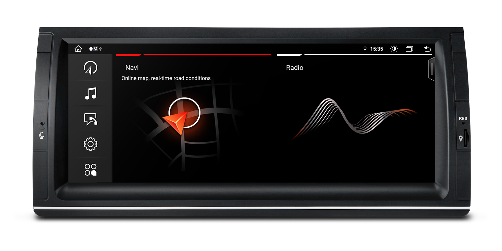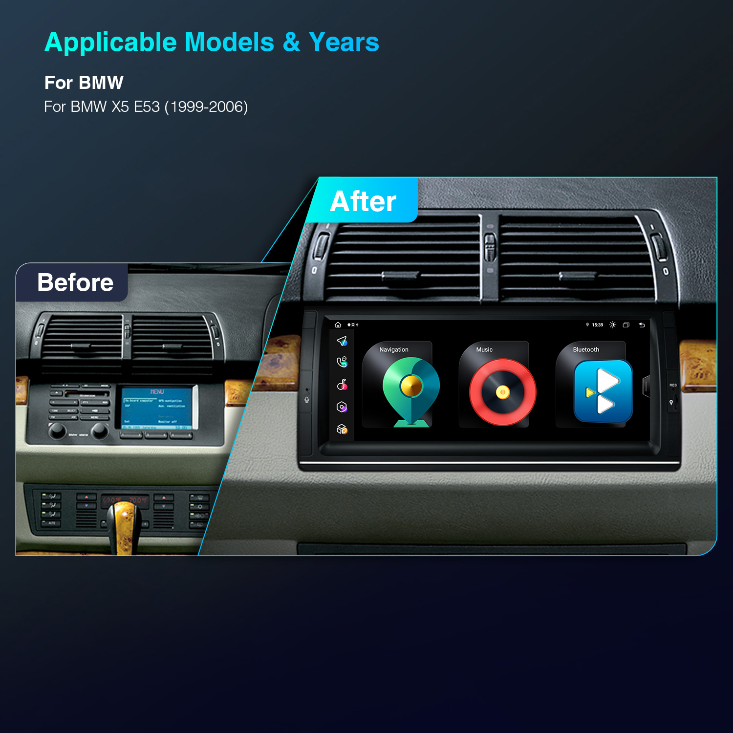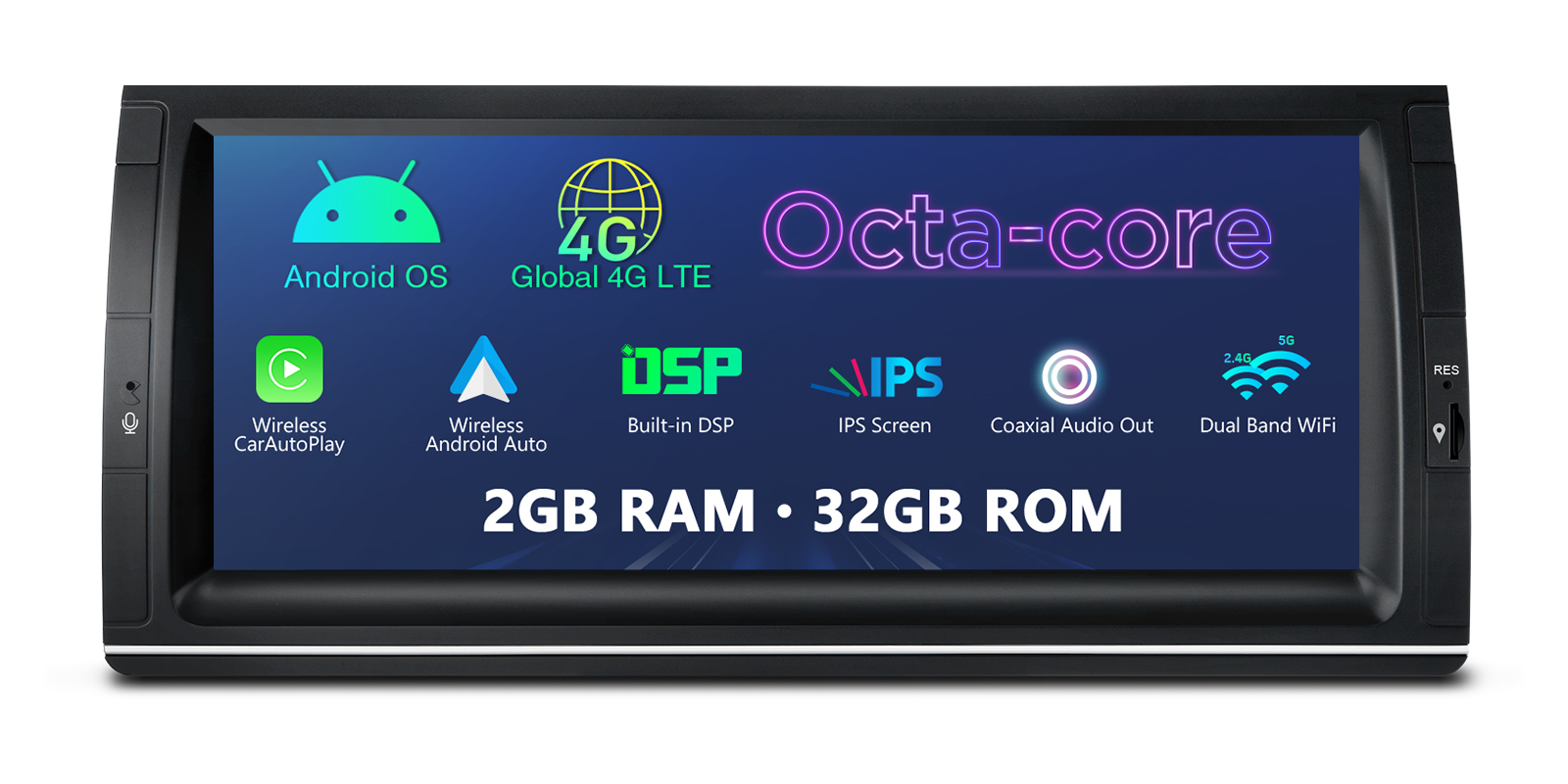 Android Octa Core 2GB DDR4 RAM + 32GB ROM 10.25” 1280×480 HD IPS Screen Car Stereo Multimedia Player GPS Navigation System with Dual UI Automotive-grade Hardware Global 4G LTE Network Screen Mirroring Built-in CarAutoPlay & Android Auto & DSP Radio with RDS Coaxial Audio Output for BMW X5 E53