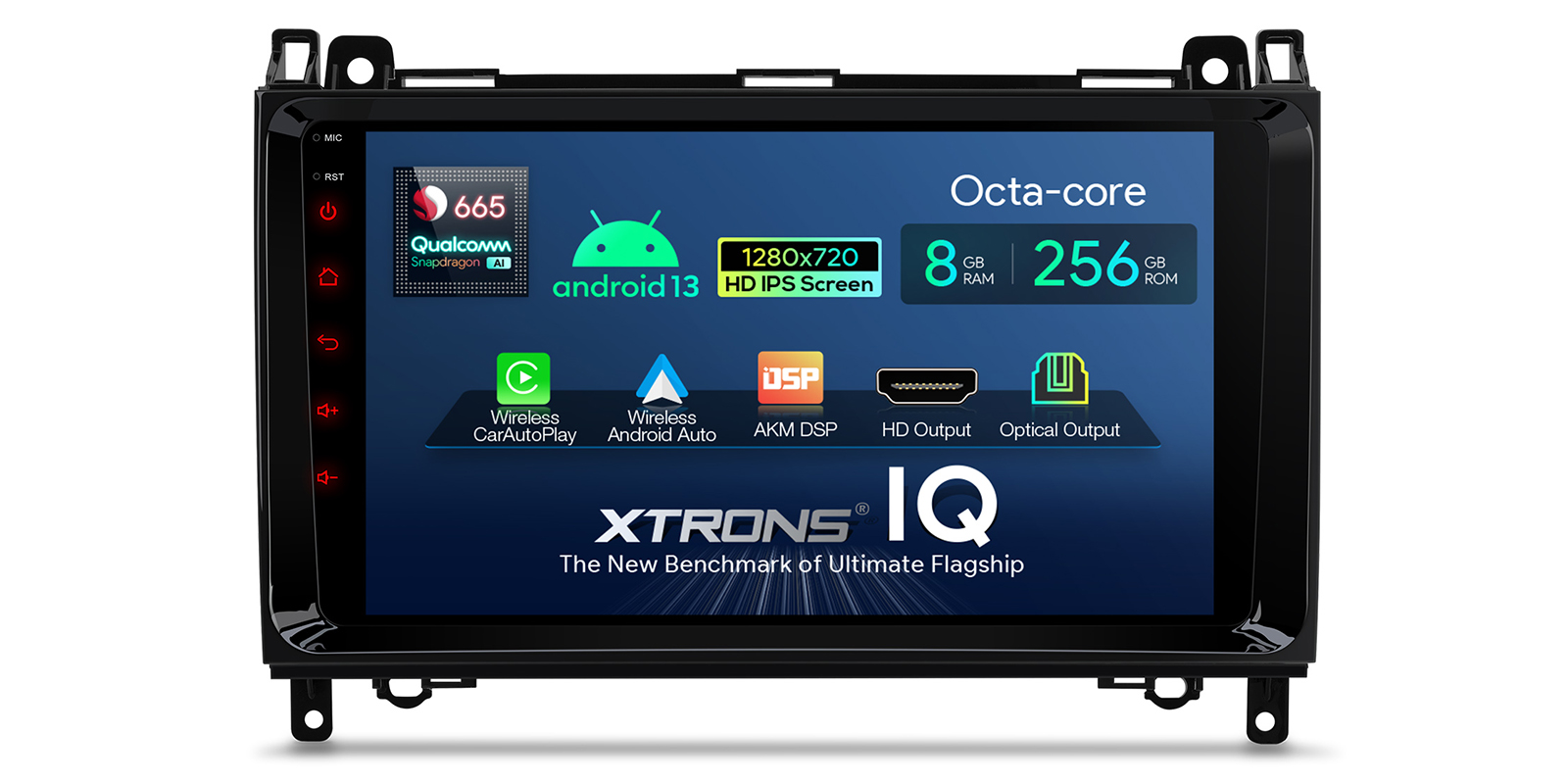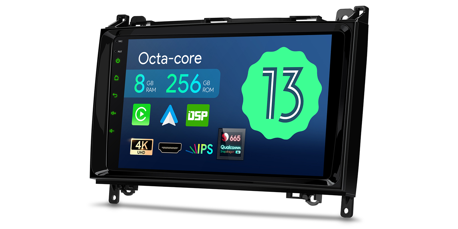 Android 13 Qualcomm 665 Octa Core 8GB RAM +256GB ROM 9” 1280×720 QLED Display Car Stereo Multimedia Player GPS System with Integrated 4G Solution Built-in Wireless CarAutoPlay & Android Auto & AKM DSP Custom HDMI Output Coaxial/Optical Audio Output Fit for Mercedes-Benz A-Class, B-Class, Sprinter, Viano and Vito
