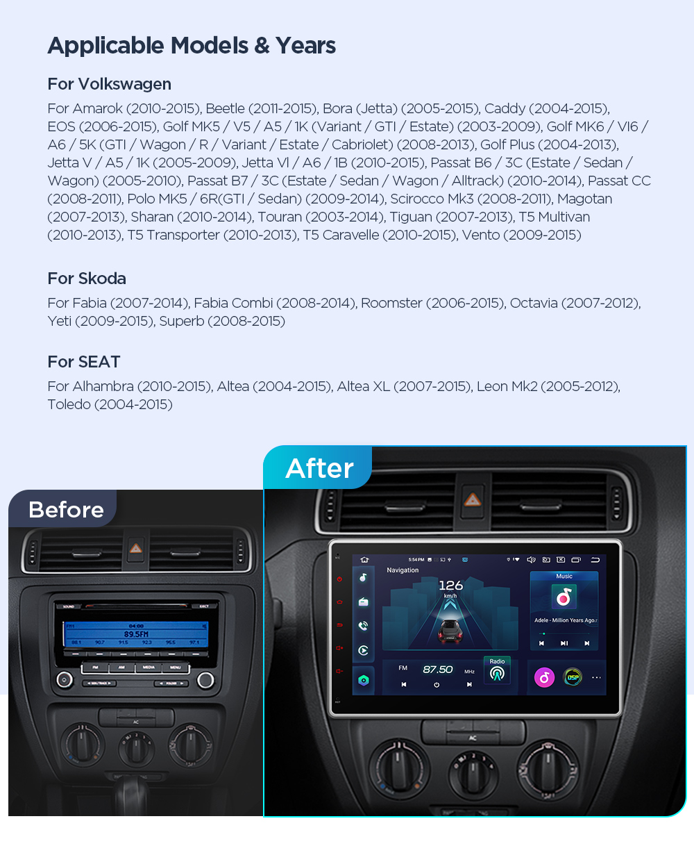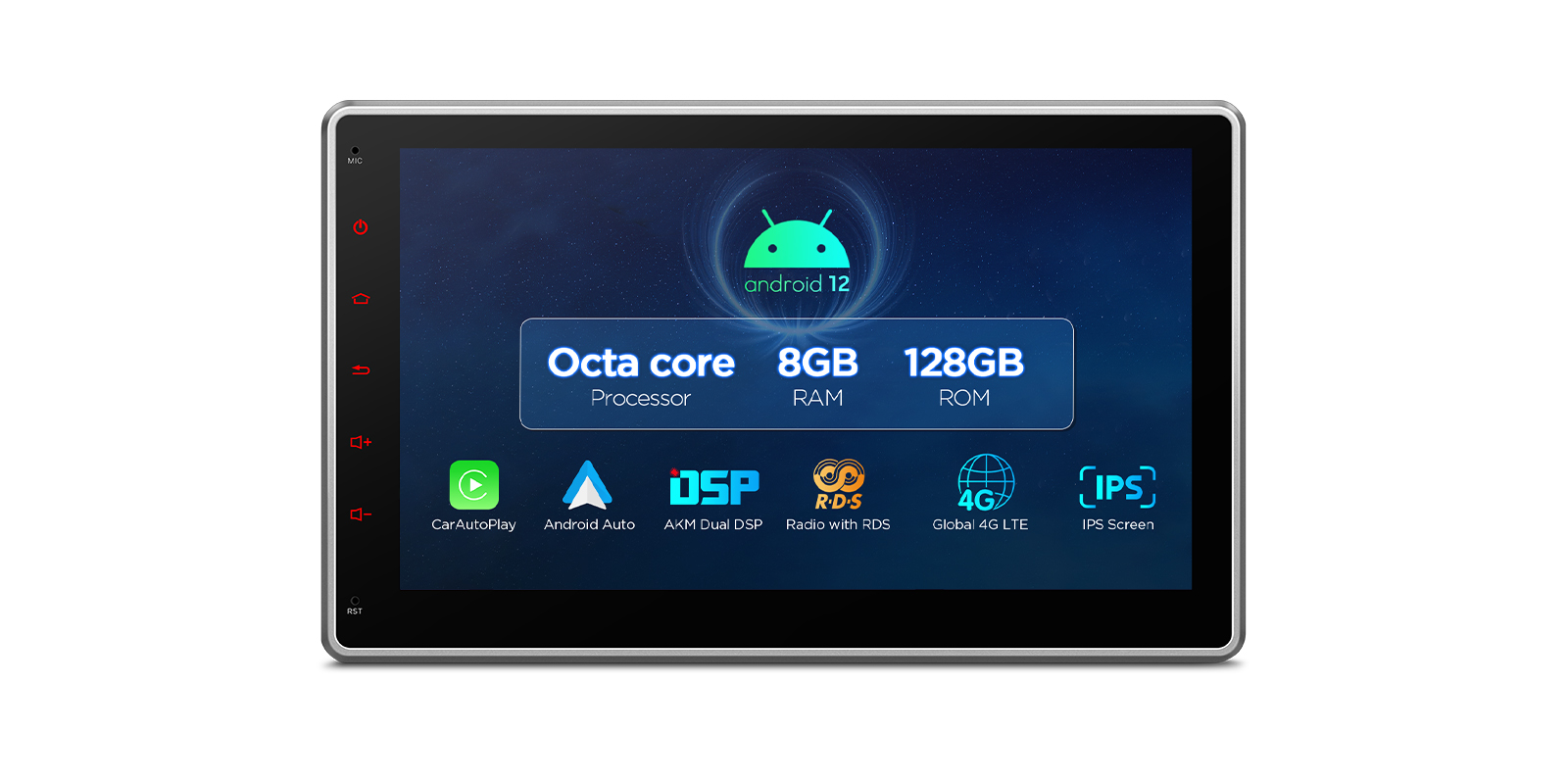 Android 12 Octa Core 8GB DDR4 RAM + 128GB Solid State ROM 10.1” 1280×720 Rotatable QLED Screen Car Stereo GPS Navigation System with Built-in Gravity Sensor Integrated global 4G Solution Built-in CarPlay & Android Auto & ROHM DSP TDA7708 Radio with RDS TDA7388 Amplifier USB Tethering Adaptive UI Support AHD Cameras for Volkswagen/Skoda/Seat